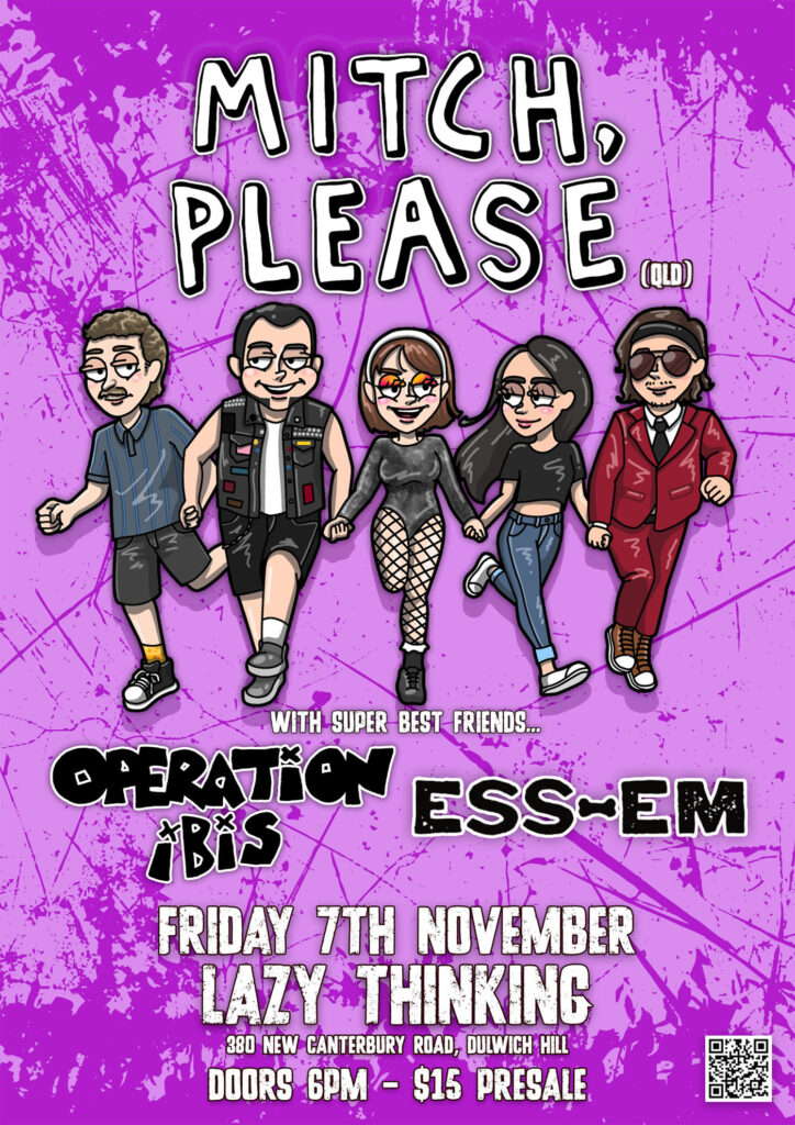 Mitch, Please are a five-piece Meanjin/Brisbane punk nerd band. A bit punk, a bit pop, a bit light and a bit heavy, plus lots of other bits all whipped up together to make a crunchy, creamy, salty, dang good time.